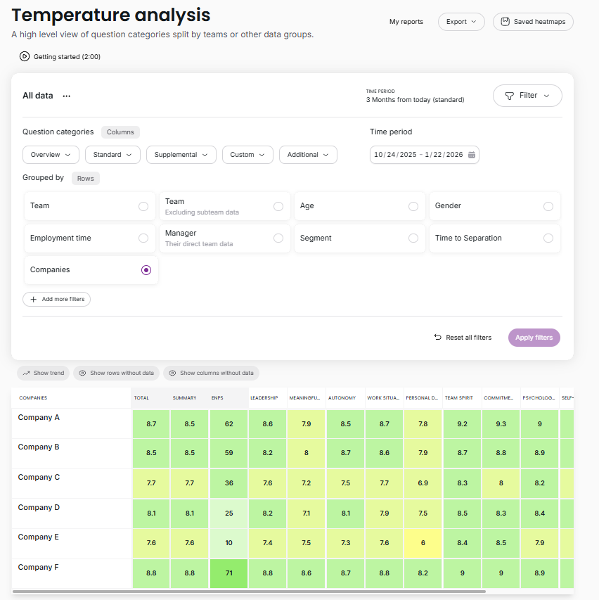 - This view provides an overview of the temperatures but doesn’t include drill-down to individual questions, unlike the regular heatmap.