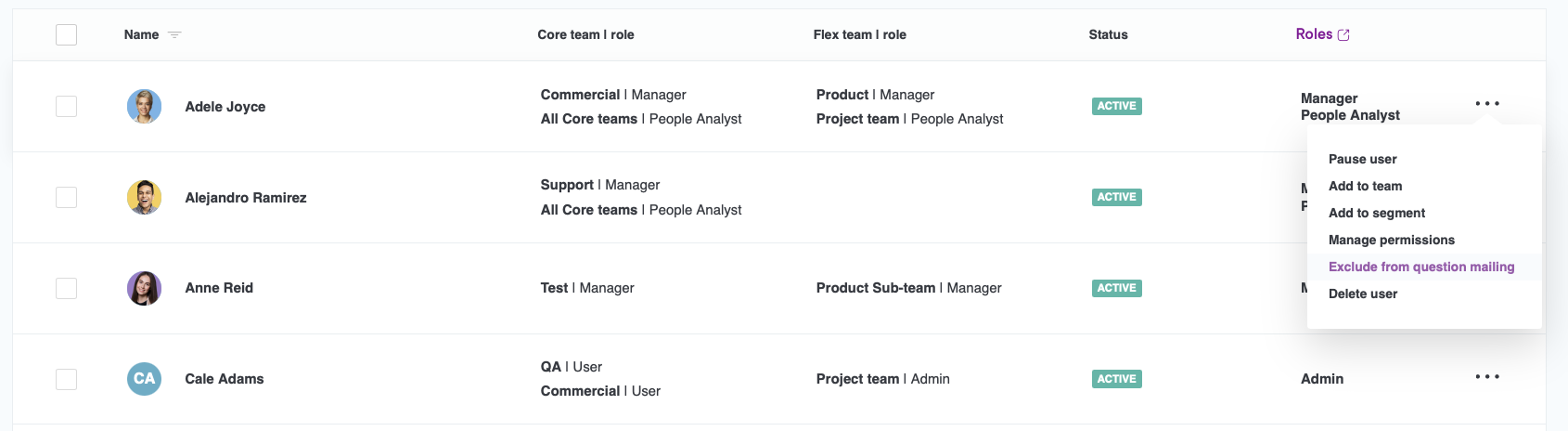 - Click the three dots next to the user and select "Exclude from question mailing". You can also find the button by clicking on a user profile.