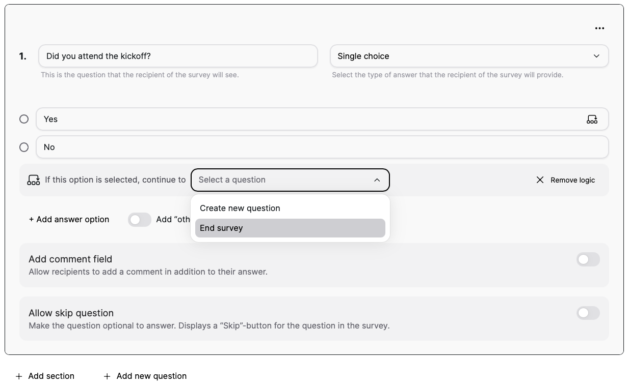 - After adding question logic, click the logic icon and choose where the respondent should go next based on the selected answer.