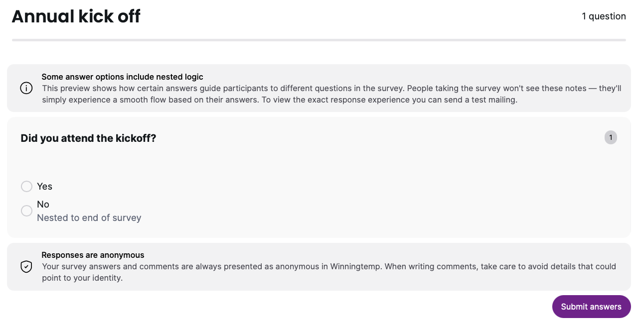 To make sure the question logic works as intended, you can preview your survey before sending it. You can find Preview at the top of the Questions page or on the Summary page.