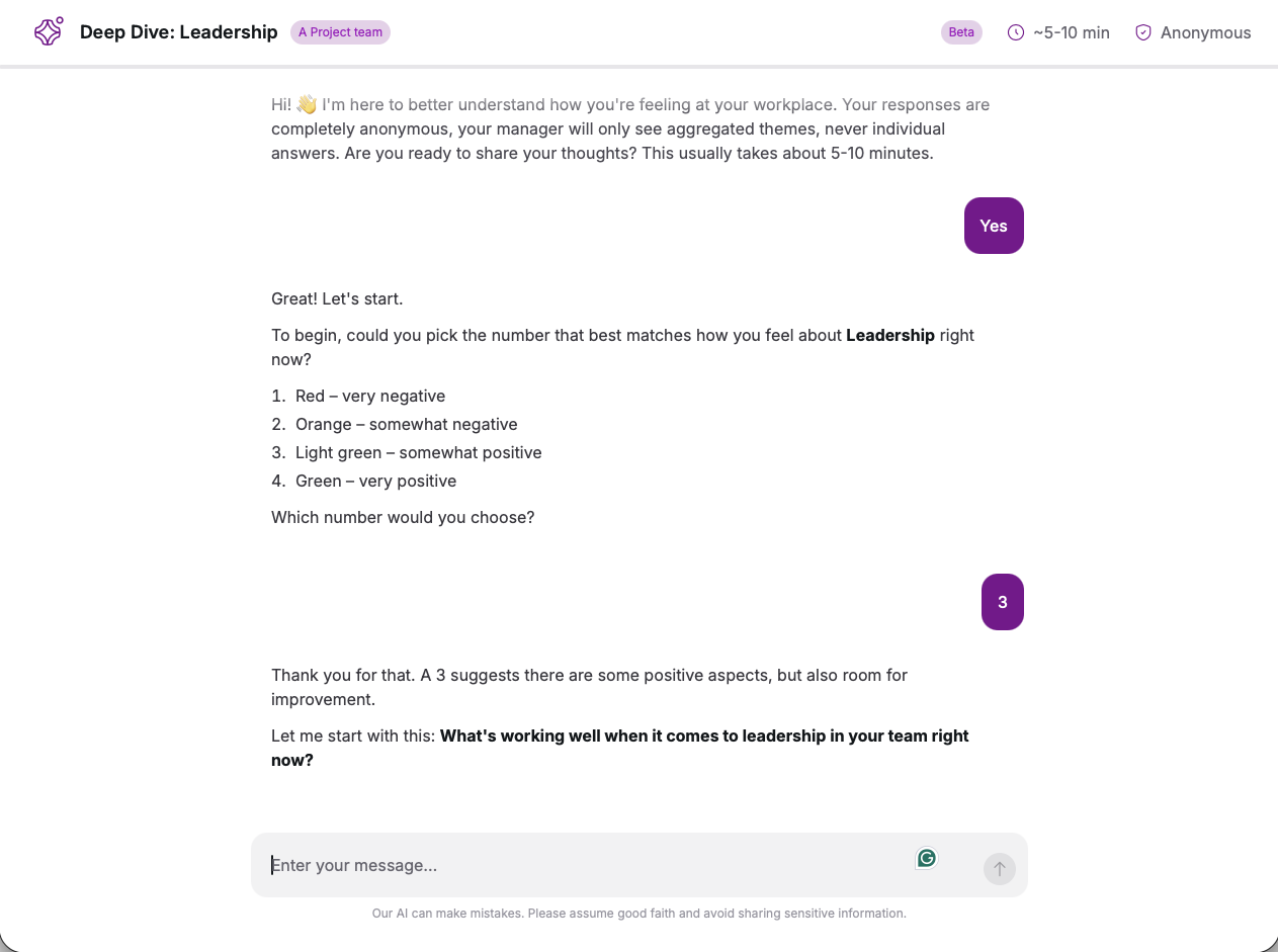 - Team conversations - The AI conducts anonymous 5–10-minute conversations with your team members.