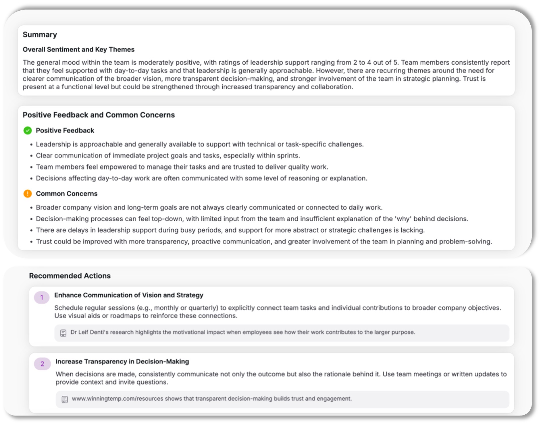 After the Deep Dive closes, your manager receives a summary with the main themes, insights, and recommended actions. The goal is to help your manager understand what the team is experiencing and take meaningful steps to improve things.