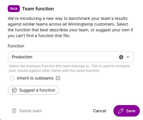 Team function describes what a team does in your organisation, for example, Sales, IT, or Finance. Setting a function helps you classify your teams and later on compare their results against similar teams across all Winningtemp customers.
