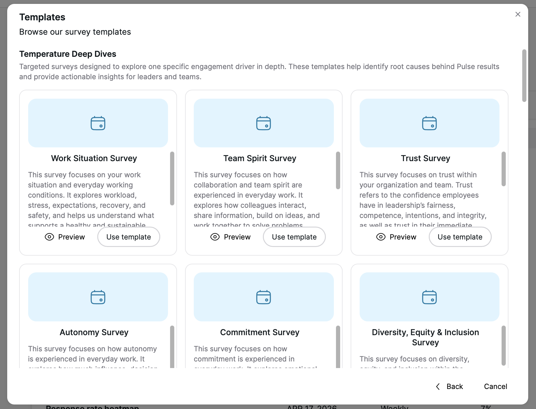 With Focus survey templates, you can launch a survey faster and with less manual setup. All templates are science-based and quality assured, giving you high-quality feedback and better data without building everything from scratch.