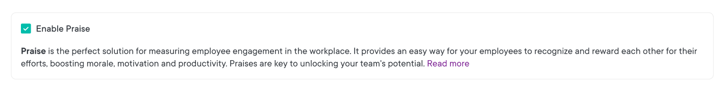 The Praise feature is active by default. If you wish to change the settings, you can easily toggle “Enable Praise” to keep the feature active or inactive for your organization.