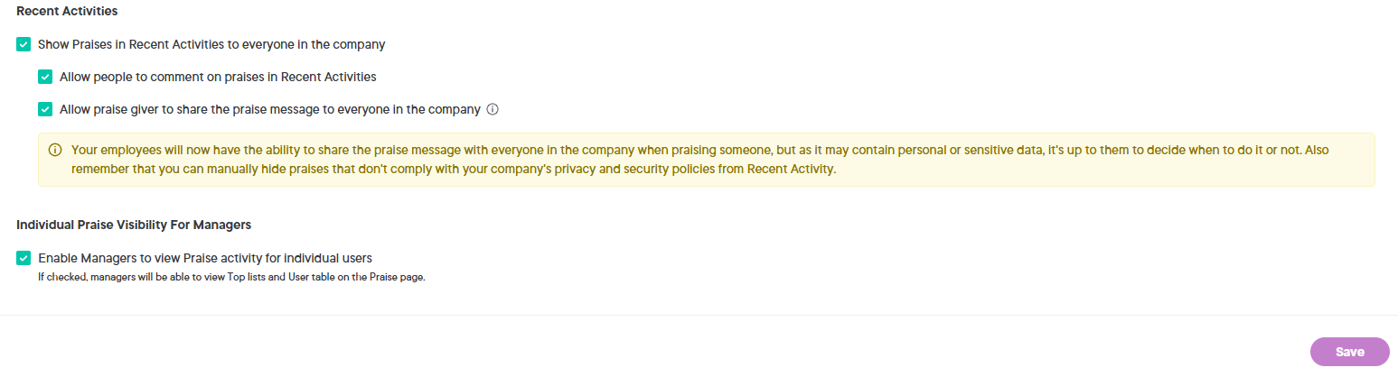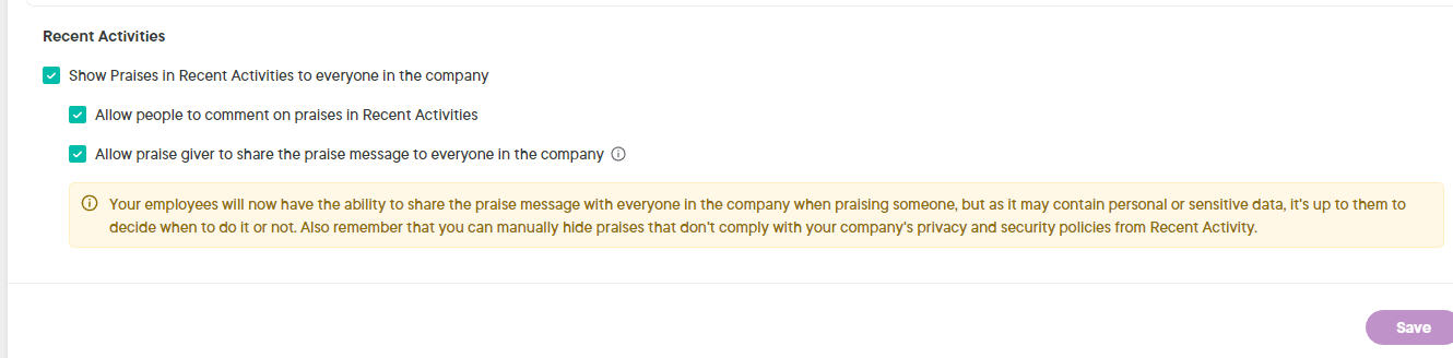 If you want to display Praises in recent activities on the Overview page, check the box Show Praises in Recent Activities to everyone in the company. You can also deactivate praises from recent activities by unchecking the box.