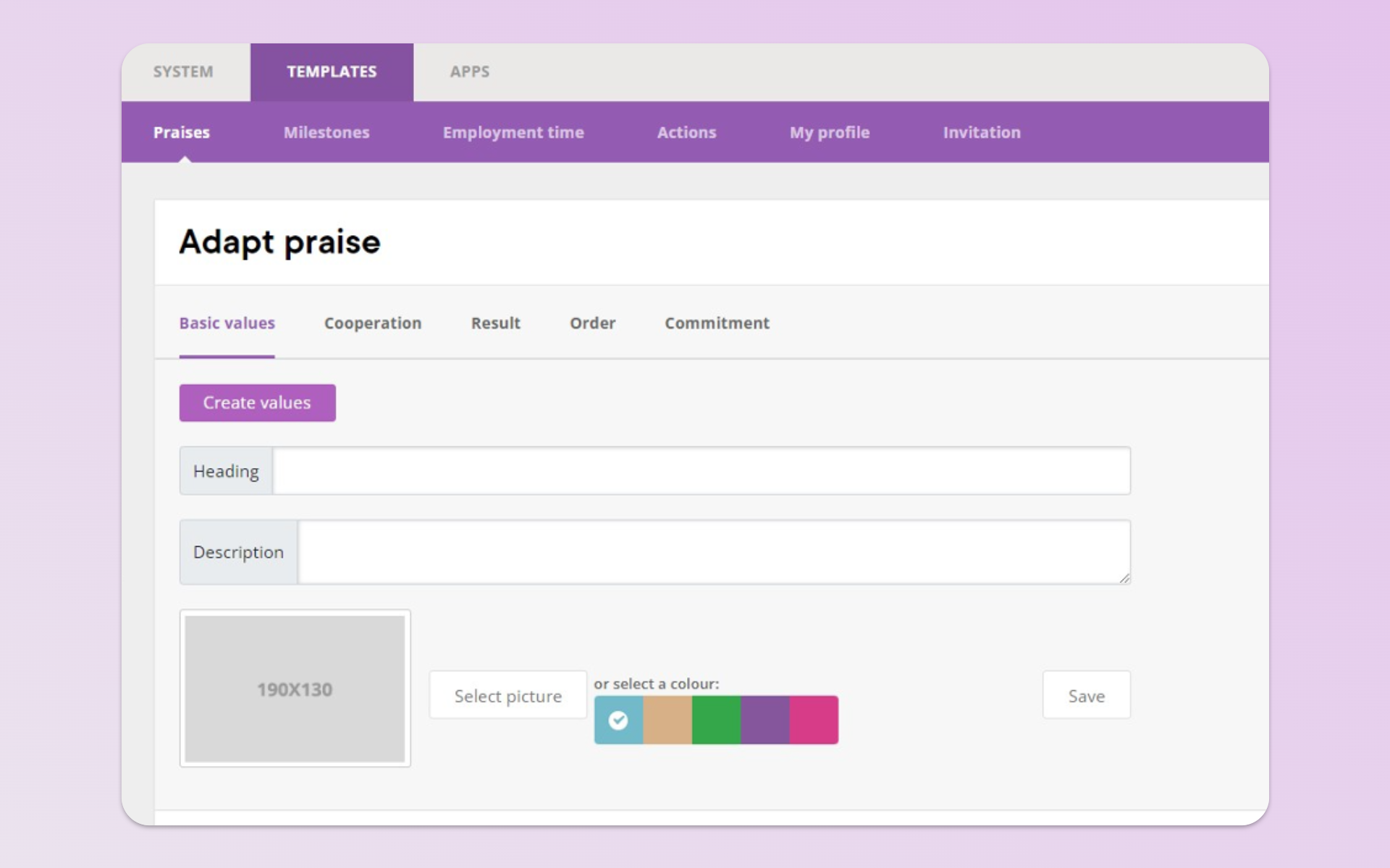 - Under Praise and Basic values, click Create values