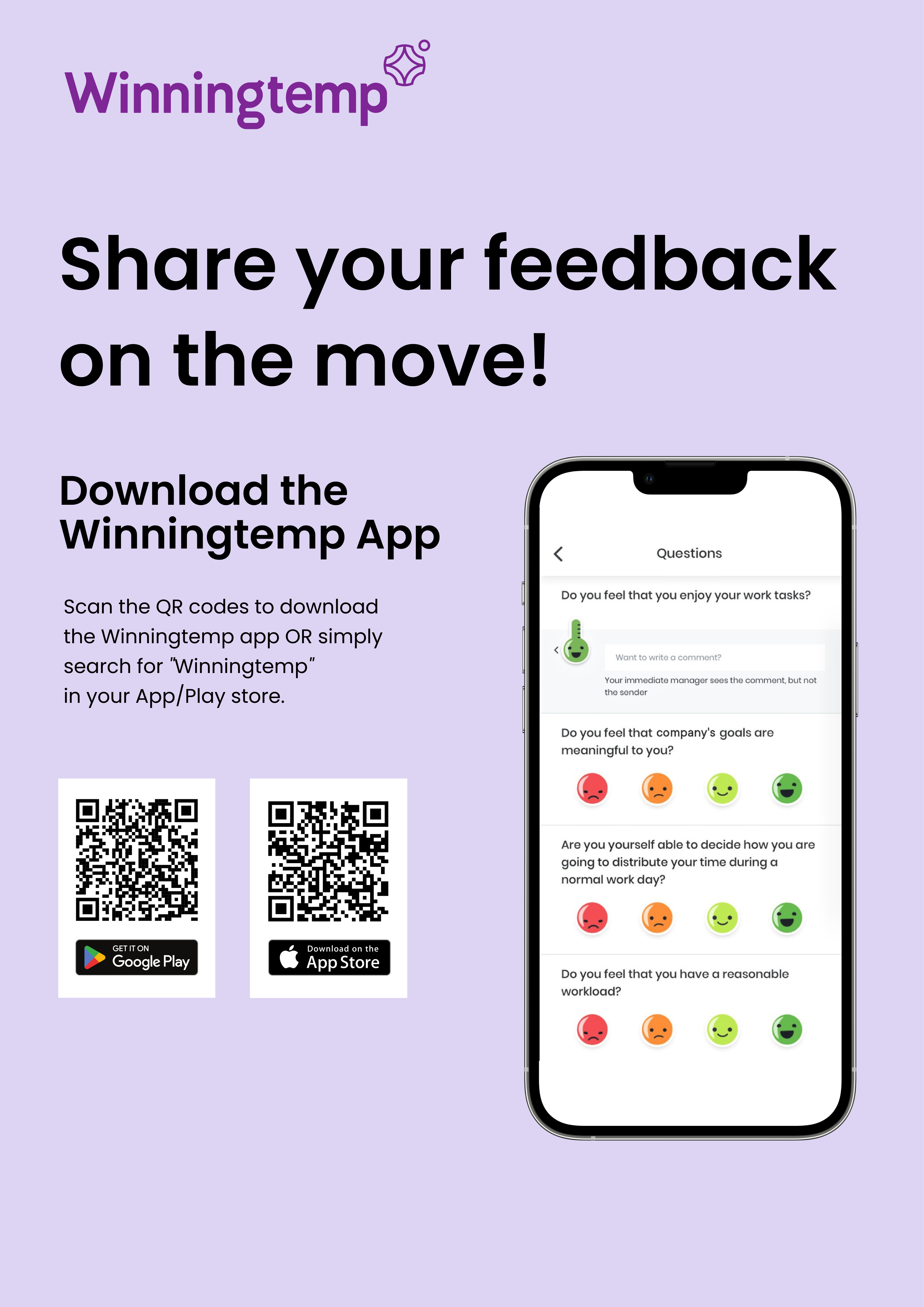 Winningtemp is built with a strong focus on security and anonymity. All responses and comments are completely anonymous, no one can see who answered what or wrote a comment.