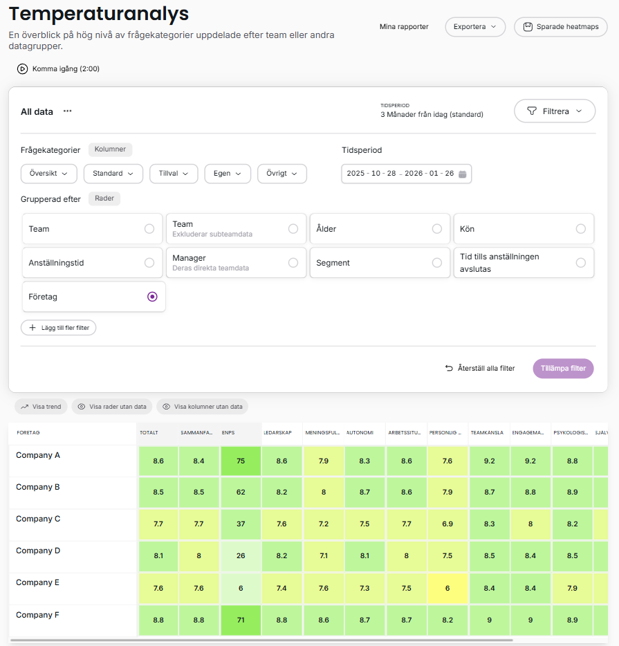 Konsoliderad temperatur ger globala företag och organisationer med flera dotterbolag en snabb och tydlig överblick av data från olika instanser i Heatmap-analysen. Som systemadministratör kan du se den övergripande temperaturen, temperatur per kategori och eNPS, allt samlat på ett ställe.