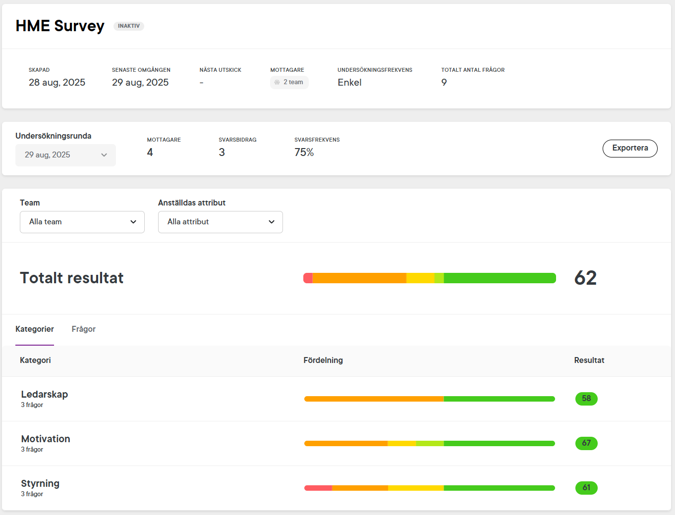 - Klicka på en frågekategori för att gå djupare in i varje fråga och se datan i mer detalj.