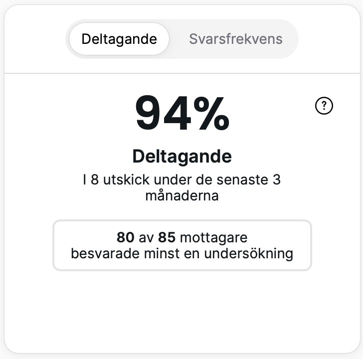 Exempel: Om 4 medarbetare fick 3 undersökningar och 3 av dem svarade på minst en, är deltagandet 75 %.