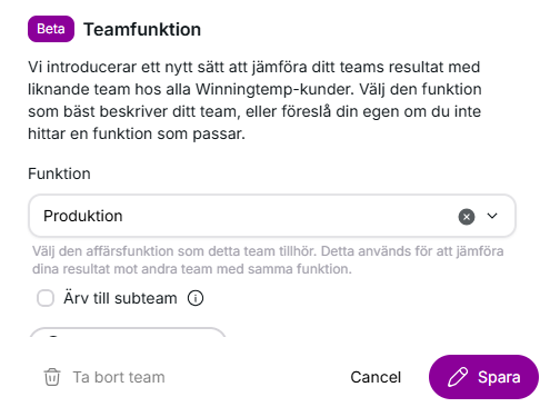 Teamfunktion beskriver vad ett team gör i din organisation, till exempel sälj, IT eller ekonomi. Genom att ange en funktion klassificerar du dina team och kan längre fram jämföra deras resultat med liknande team hos alla Winningtemp-kunder.