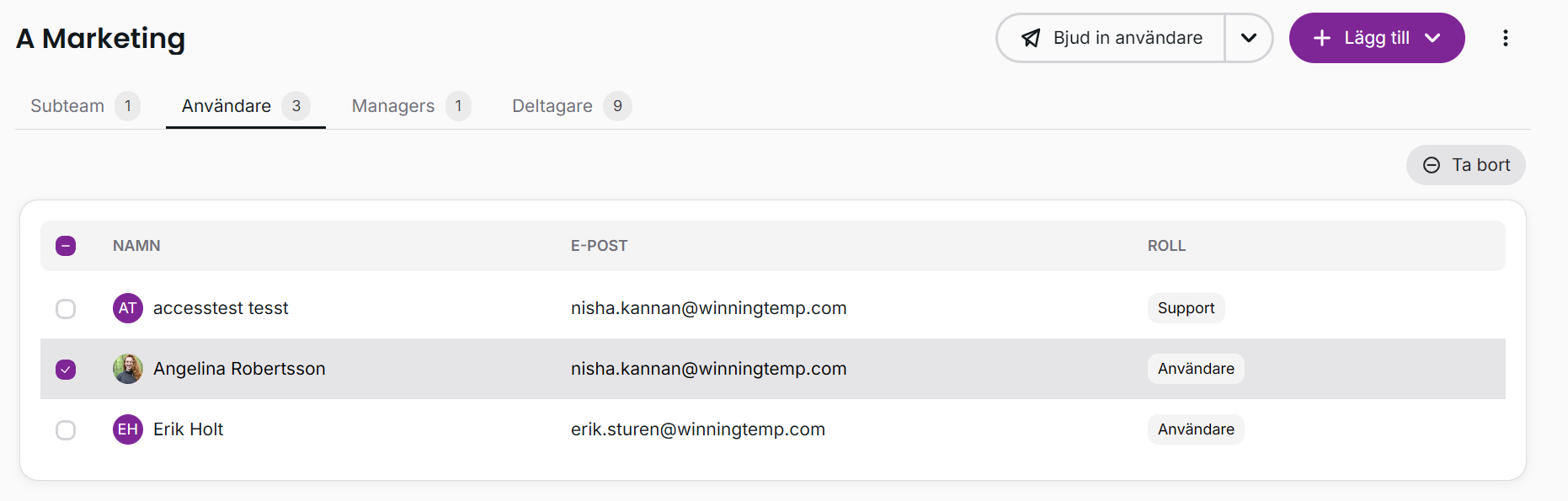 - Markera användarna du vill ta bort genom att bocka i rutan till vänster om dess namn