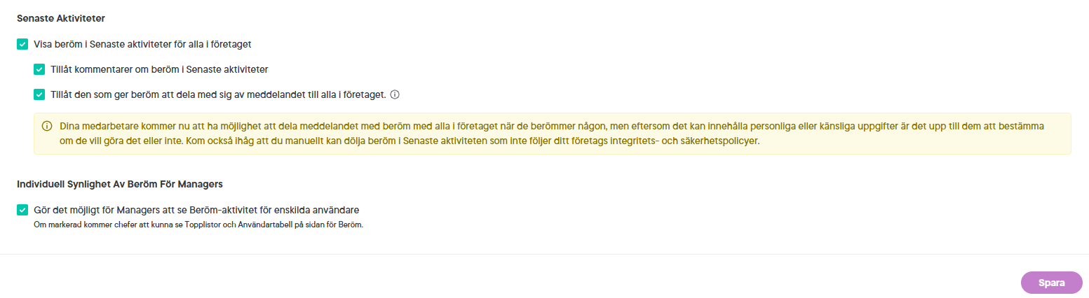 Om du vill visa beröm i aktivitetsflödet på Översiktssidan markerar du rutan Visa beröm i Senaste aktiviteter för alla i företaget. Du kan också inaktivera beröm från aktivitetsflödet helt genom att avmarkera rutan.